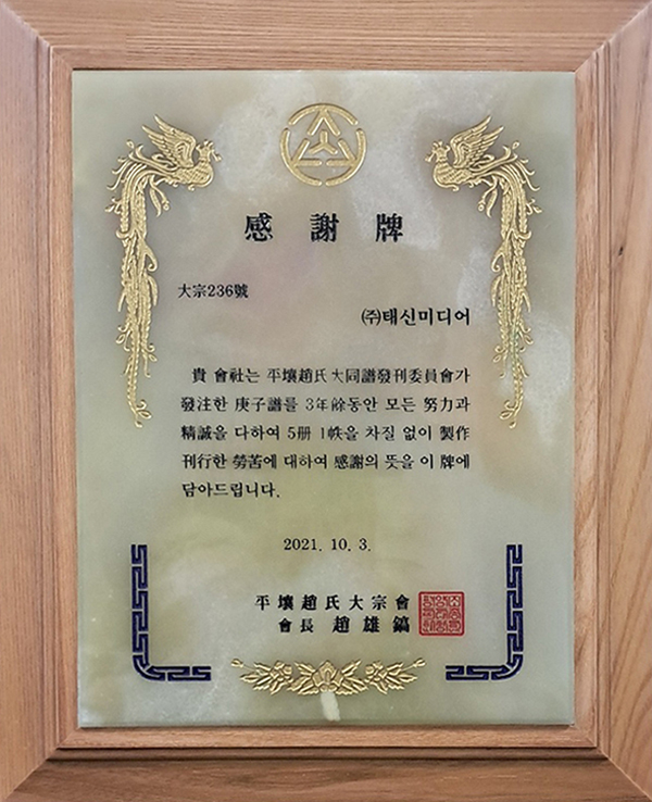 평양조씨대종회 감사패(2021.10)