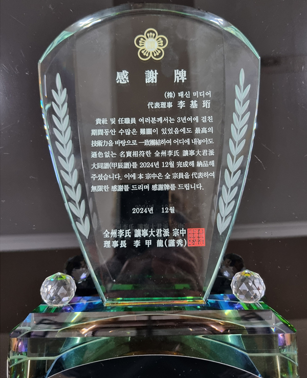 전주이씨양녕대군 감사패(2024.12)