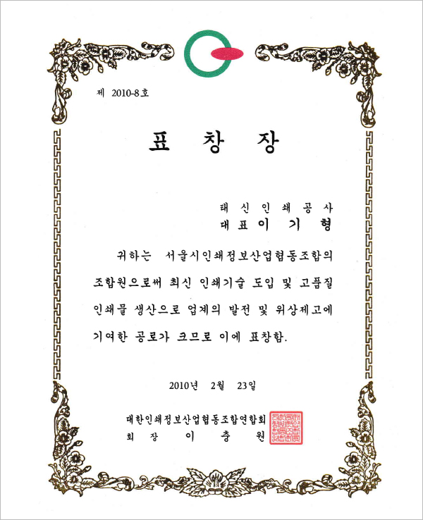 대한인쇄정보산업협동조합 표창장